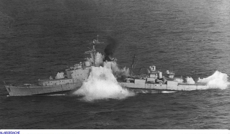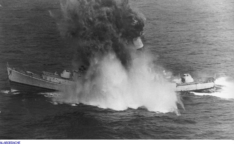 LA FIN DE L'ESCORTEEUR RAPIDE LE BASQUE PAR UN TIR DE TORPILLE DU SOUS MARIN GALATHEE