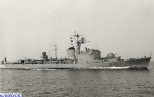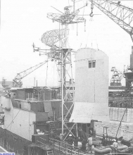 En construction. Mise en place de la cheminée en "aile d'avion" type Strombo-Valensi que l'on retrouvera sur l'Alsacien et le Vendéen. Elle avait été expérimentée à bord d'un E 50, le Bordelais.