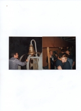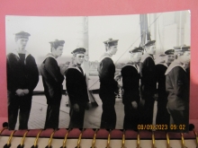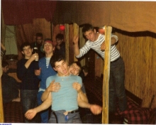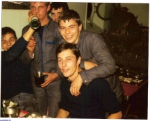 En 1977: de gauche à droite, 1er rang Pierre FLATRESSE dcd en 2017, puis CORRE ou LECORRE, 2ème rang avec la quille JC MICHAUD, l'accordéoniste JP SLOBODA, avec les lunettes LE HIR, le quart à la main inconnu,le verre à la main Bernard OCCELLI,à l'arrière plan sous le hublot DESMOND.
