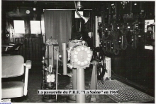 1970 : La passerelle de la Saône. Au premier plan le chadburn et le fauteuil du "pacha". Devant la traditionnelle barre à roue, le gyro-compas de route. Au fond l'indicateur radar et le rideau qui permet de lire l'écran malgré la lumière du jour. La passerelle est restée proche de celle des navires de commerce contemporains. C'etait vraiment une autre époque. Comme cela parait lointain....40 ans !