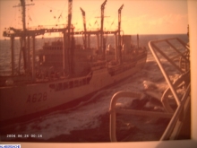 La Saône ravitaille à la mer un porte-avions. (Le Foch ou le Clémenceau) (photo X)