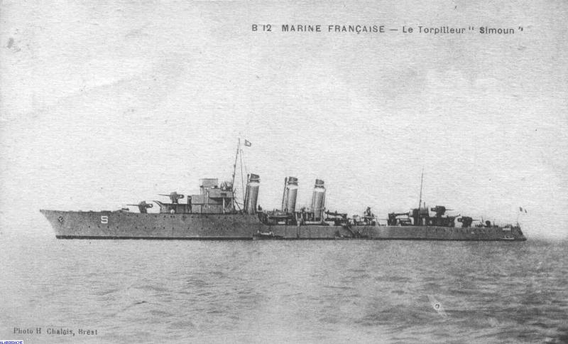 Le Simoun à son entrée en service. Les cheminées n'ont pas encore été raccoucies. Les masques des pièces de 130 mm sont peu enveloppantes et 1 canon de 75 mm AA est disposé sur un petit roof entre les 2 affuts triples de tubes lance-torpilles. Il sera remplacé par 2 canons de 37mm AA.