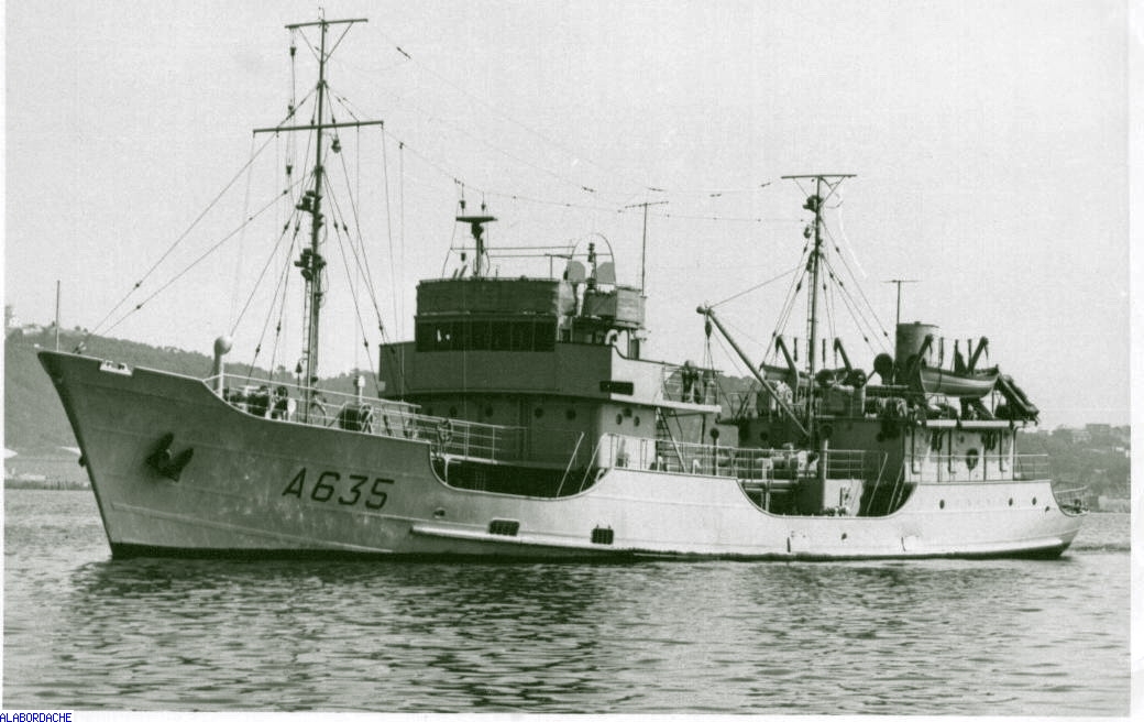Ravitailleur de région RUMMEL , sister ship du SAHEL , basé à Toulon - Ravitmt île du Levant en eau - gaz-oil - repêchage de torpilles etc... Photo du 5 août 1970 - DCAN TOULON . Tchao ... Bob